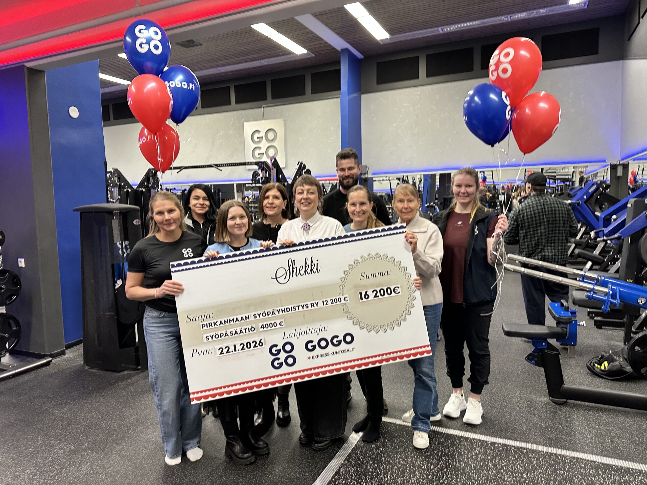 GOGO Express -kuntosalien ja GOGO Liikuntakeskuksien joulun hyväntekeväisyyskampanja keräsi upean 16 200 euron lahjoituspotin, joka ohjattiin syöpätyön tukemiseen sekä paikallisesti että valtakunnallisesti. Lahjoituksesta 12 200 € lahjoitettiin Pirkanmaan Syöpäyhdistys ry:lle, ja lisäksi GOGO lahjoitti 4000 € Syöpäsäätiölle, joka tukee valtakunnallisesti syöpätutkimusta ja syövän ehkäisyä sekä turvaa sairastuneille tukipalveluita Suomessa.